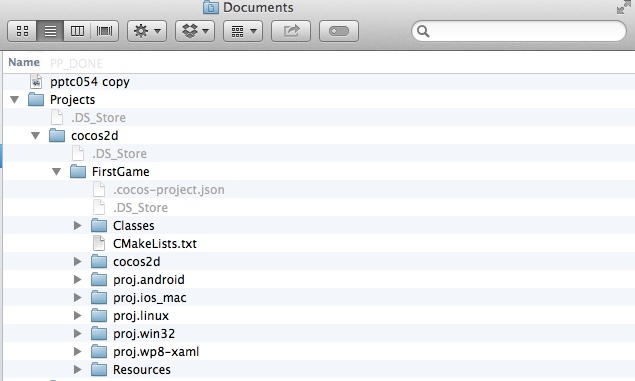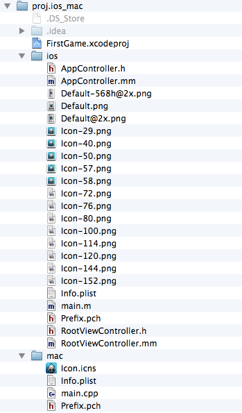 Như bạn có thể thấy, mỗi thư mục chứa tất cả các code, tài nguyên cụ thể của nền tảng và quan trọng nhất là các file project cho mỗi nền tảng khác nhau. Trong trường hợp của ios_mac, đặc biệt hơn một chút, nó tiếp tục chứa các thư mục cụ thể của nền tảng cho từng nền tảng.
