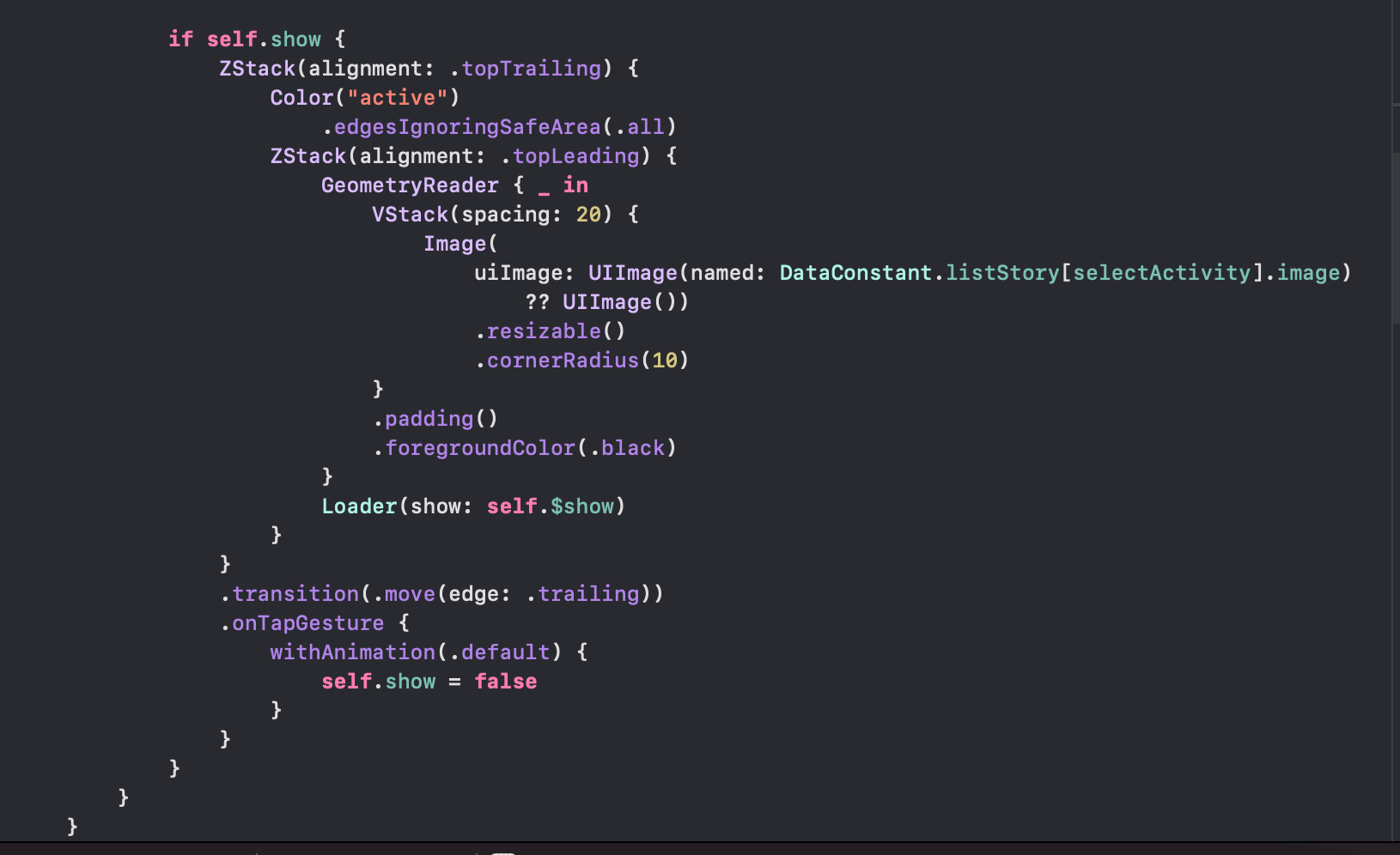 Và ta thêm gesture vào VStack mỗi khi ta click thì nó sẽ cập nhật lại select story và show ra cái ảnh story cho ta thấy.