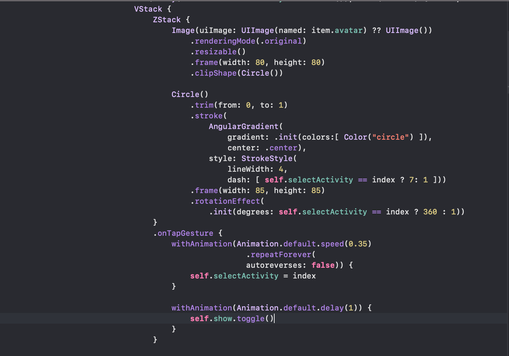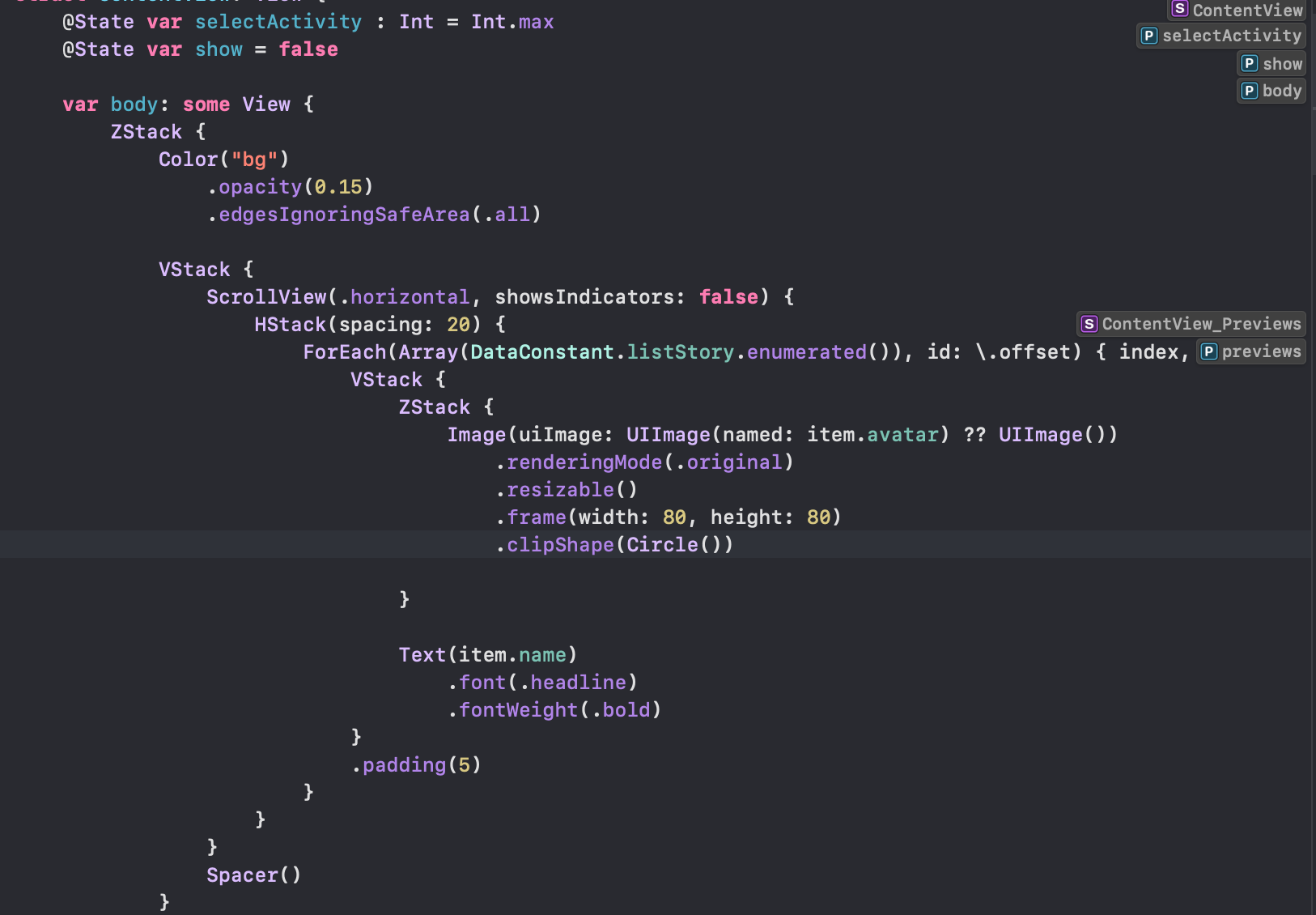 Tiếp tục ta sẽ chạy một vòng For để hiển thị các Story của ta hiển thị liên tiếp các Vstack để hiển thị hai thằng là avatar và tên của người đăng . Chú ý ở đây ta sẽ để avatar image vào trong một thằng Zstack. Mục đích để xí ta để một cái circle ngoài nó để tạo hiệu ứng animation.