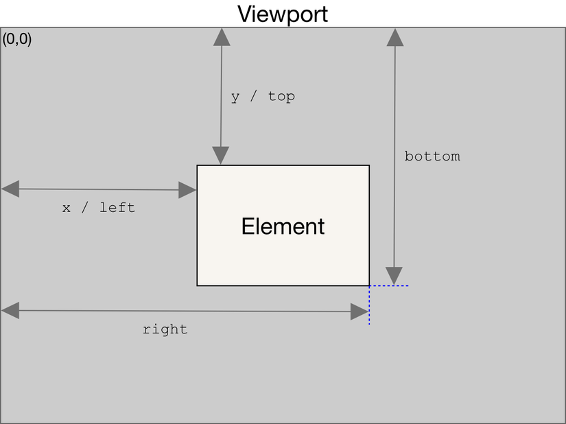 Phương thức Element.getBoundingClientRect() returns size và vị trí của element đó, vị trí là vị trí tương đối của element đối với viewport nhé