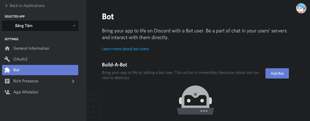 Sau khi tạo xong, hãy vào Application của bạn, vào tab Bot và chọn Add Bot