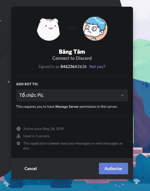 Ở output sẽ có một đường link để invite bot của bạn vào Server. Chọn Server mà bạn muốn invite bot vào (yêu cầu bạn phải có quyền Manage Server) và chọn Authorize.