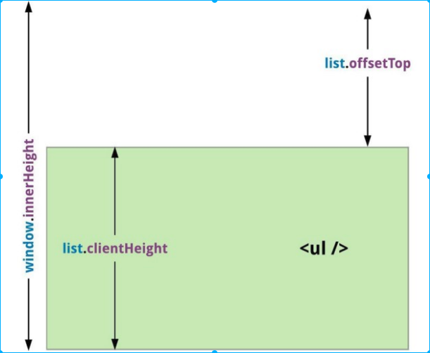 window.innerHeight— cố định (static), chiều cao của cửa sổ trình duyệtwindow.scrollY— di chuyển (dynamic), vị trí hiện tại của thanh scroll.list.clientHeight— cố định (static), chiều cao của phần từ<ul> <ul/>.list.offsetTop— cố định (static) khoảng cách từ đầu trang tới phần tử<ul>.
