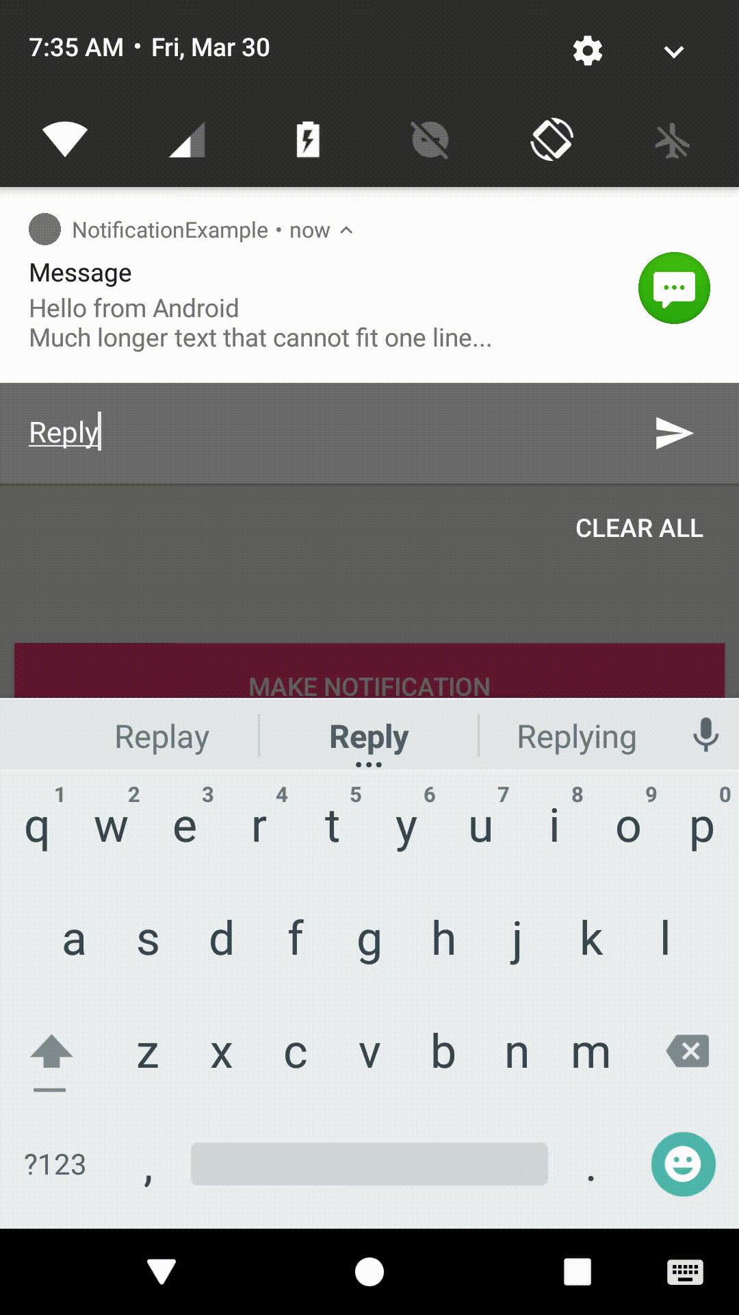 RemoteInput remoteInput = new RemoteInput.Builder(KEY_TEXT_REPLY).setLabel(replyLabel).build();