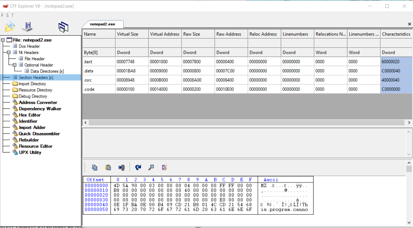 - Bên tay trái của chúng ta là bảng menu, bao gồm các phần của 1 file exe và tôi đang bật phần Section Header ( chính là Section table ) thì ta quan sát ở đây file notepad2.exe bao gồm 4 section table: .text, .data, .rsrc, .code