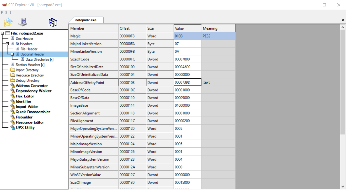 - Trong phần optional Header -> Standard COFF Fields -> AddressOfEntryPoint, đây chính là chìa khóa để chạy chương trình này. Hay hiểu theo cách khác, đối với các bạn từng học lập trình thì để thực thi 1 chương trình nào đó ta sẽ biết nó gọi vào hàm main() và thực thi tuần tự các hàm được gọi trong hàm main(), thì AddressOfEntryPoint chính là lời gọi đến hàm đầu tiên để thực thi trong hàm main() vì vậy nếu ta thay đổi giá trị của thành phần này thì sẽ gọi đến hàm khác và làm thay đổi trình tự thực thi hàm.