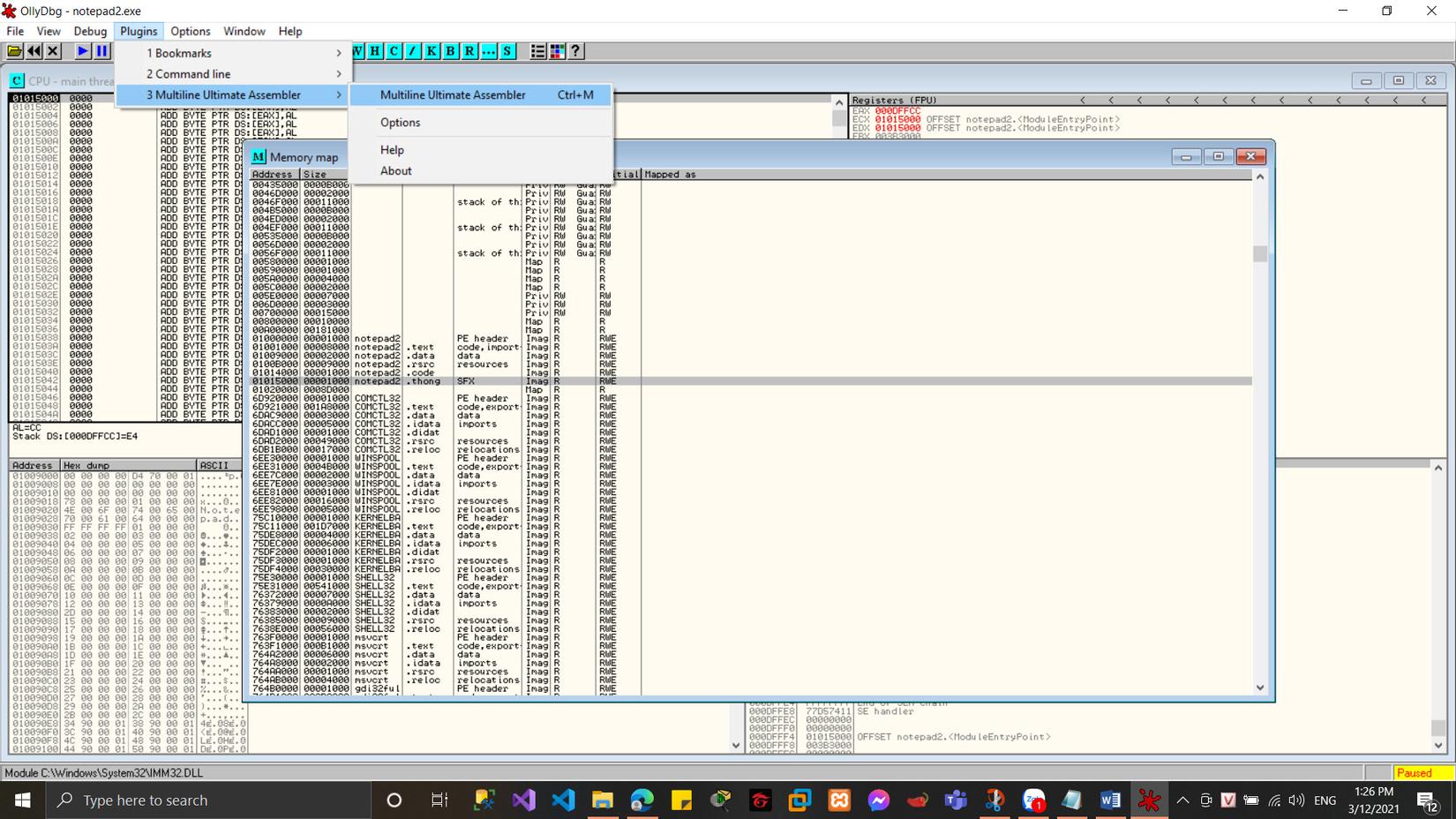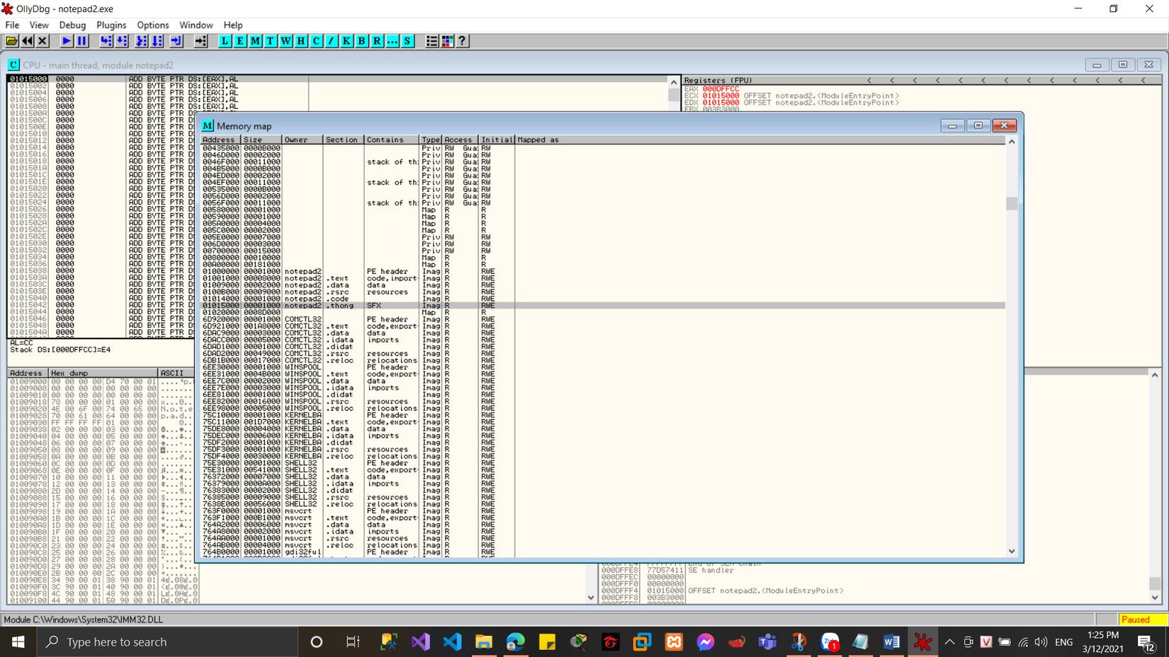 Các bạn mở công cụ ollydbg lên và kéo thả file notepad2.exe vào công cụ này sẽ được như sau: