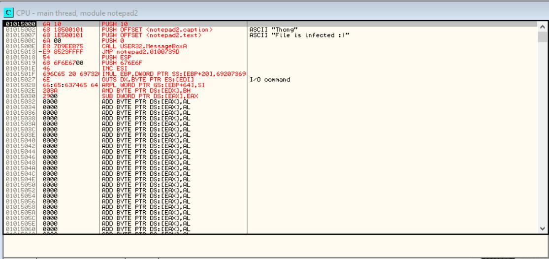 Ở đây các bạn tìm ra section các bạn đã thêm vào, trong trường hợp của tôi thì tôi đã tìm ra section .thong, giờ tôi thực thi chèn 1 đoạn code assembly vào section này: