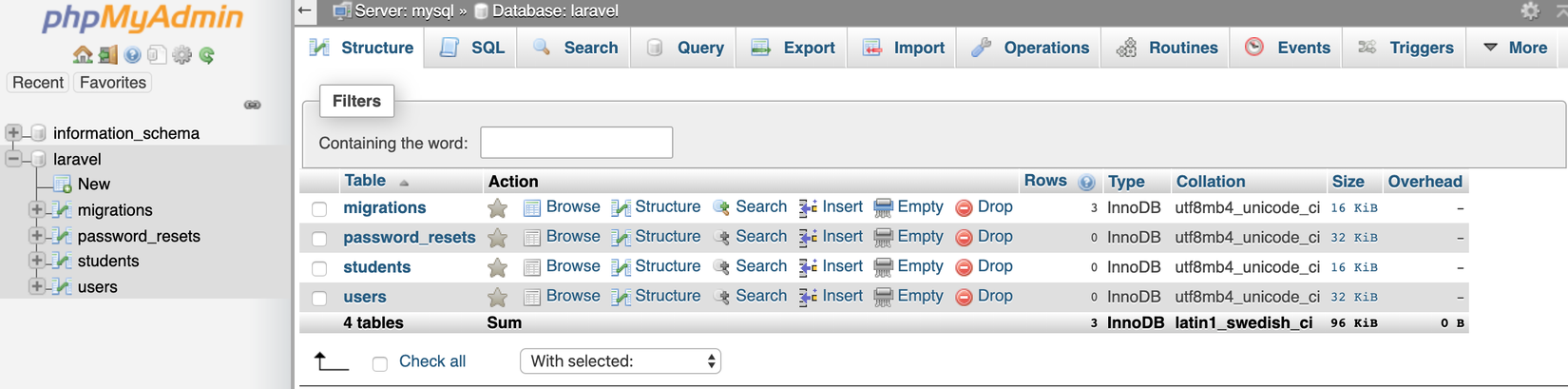 Hơn nữa thì một migration file được tạo ra ở thư mực database/migrations để tạo bảng dữ liệu. Chúng ra sẽ phải chỉnh sửa lại file này để tạo ra cột name và courses, với kiểu dữ liệu cho phù hợp với cột đó: