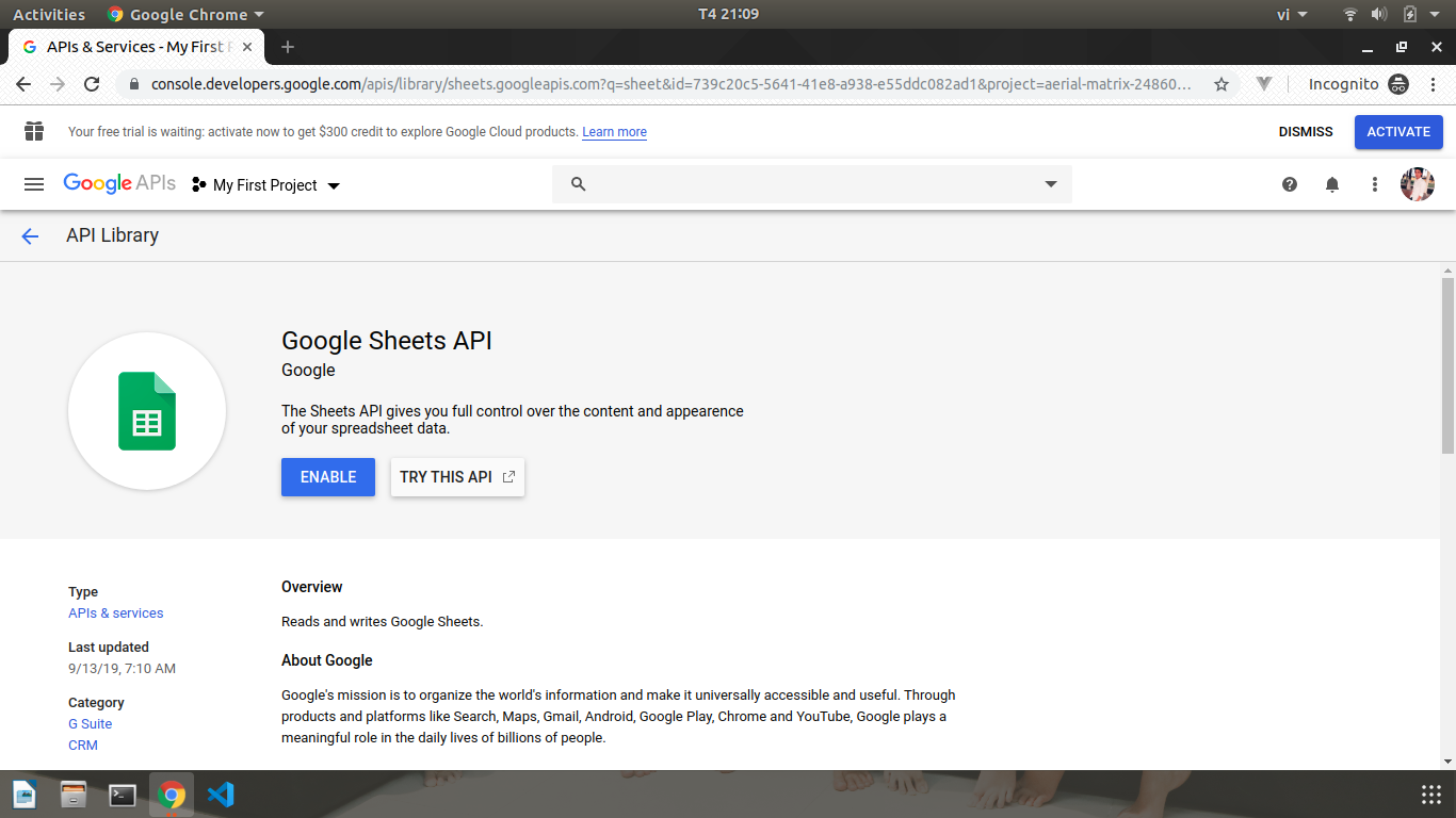 - enable Sheets API tại https://console.developers.google.com/apis/library, tìm kiếm từ khóa "sheets" ,chọn "Google Sheets API" và click enable