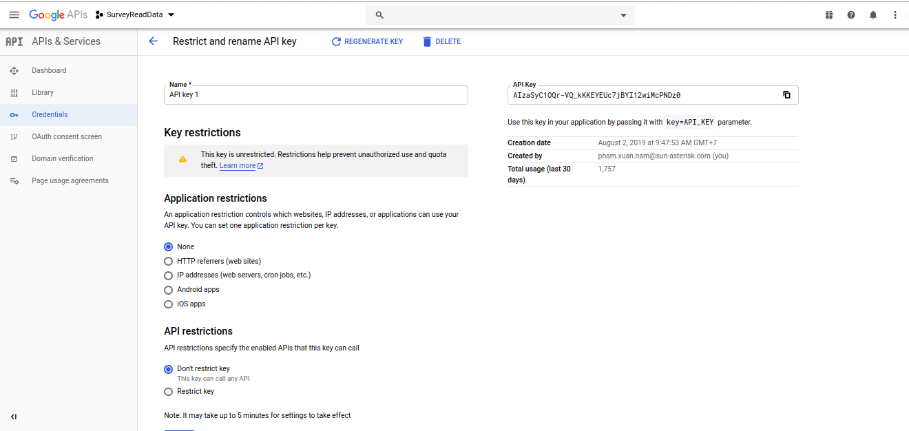 - Tới trang https://console.developers.google.com/apis/credentials -> chọn project của bạn và tạo API key và OAuth client id :