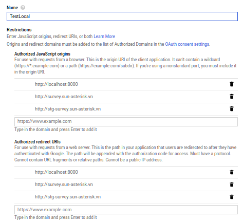 Tạo OAuth client id lần lượt: Chọn Web Application -> điền đầy đủ Name, Authorized JavaScript origins, Authorized redirect URIs (đối với Authorized JavaScript origins và Authorized redirect URIs điền đầy đủ link trang web của bạn, trường hợp test local thì điền link local ví dụ như http://localhost:8000)