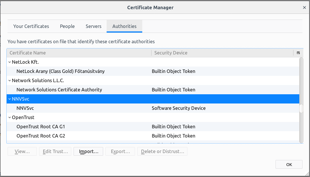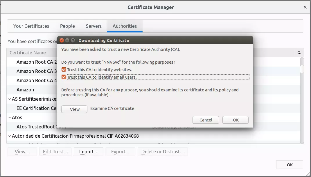 Đầu tiên, mở Mozilla Firefox lên và truy cập vào đường dẫn sau: about:preferences#privacy. Sau đó, bạn kéo xuống dưới cùng của trang, tại phần Certificates chúng ta nhấp vào View Certificates..., tại popup này, bạn chọn tab Authorities rồi nhấp vào Import... và chọn file rootCA.pem mà chúng ta vừa tạo ban nãy. Sau khi chọn file, chúng ta sẽ có màn hình sau: