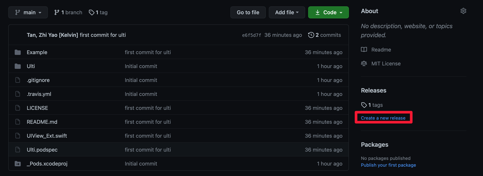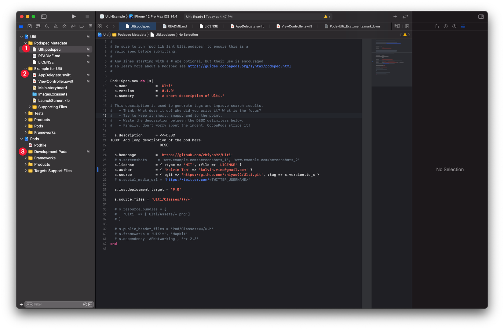 Vì chúng ta đã tag version là 0.0.1, chúng ta cần thay đổi version trên Ulti.podspec để version phù hợp với tag.