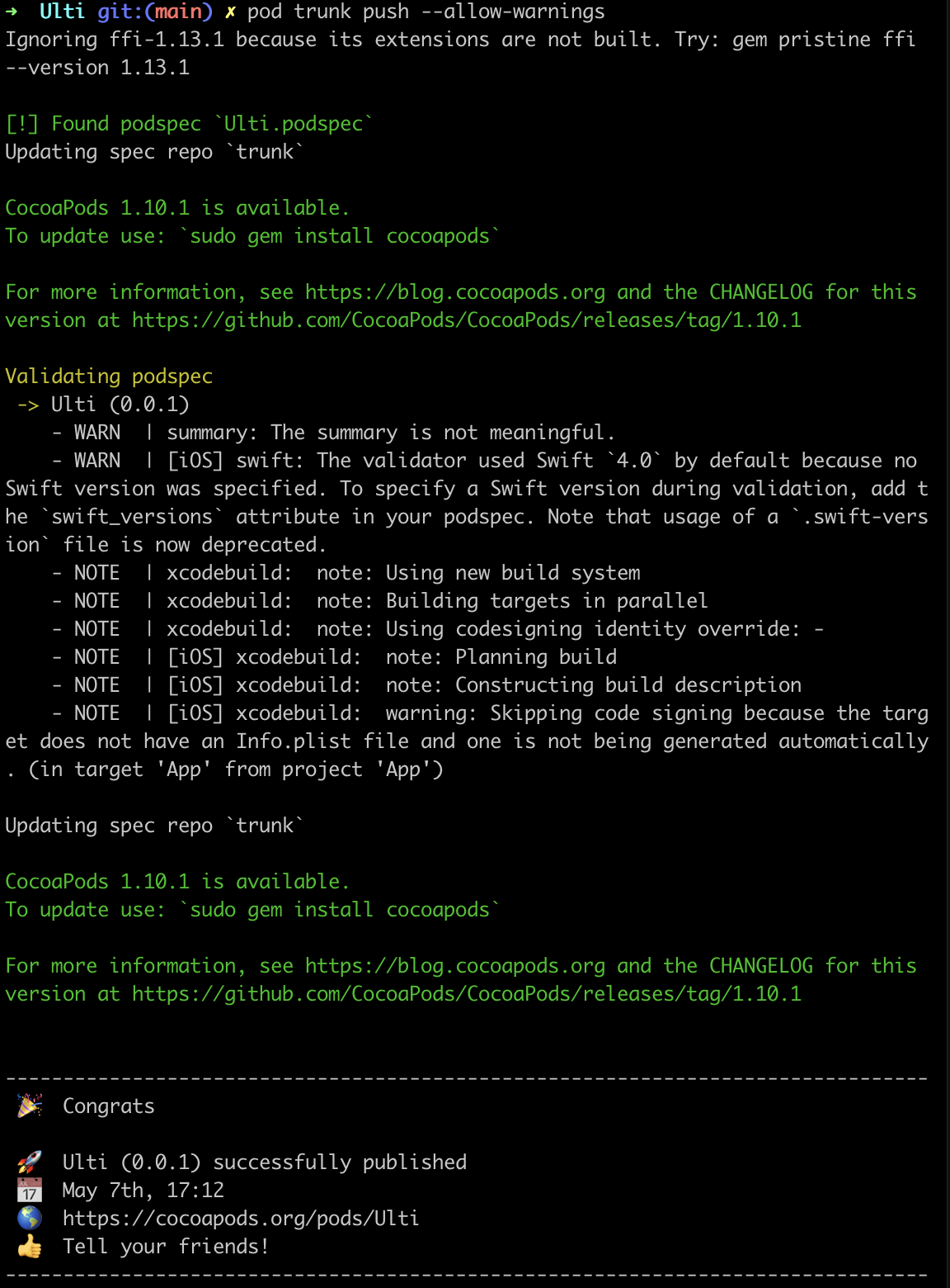 pod trunk push --allow-warnings