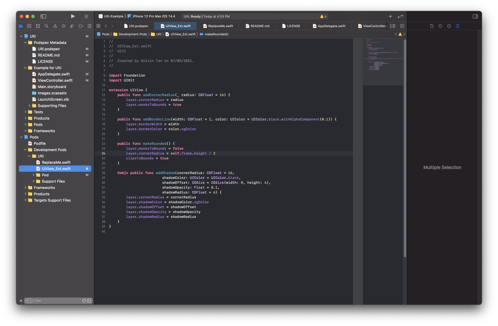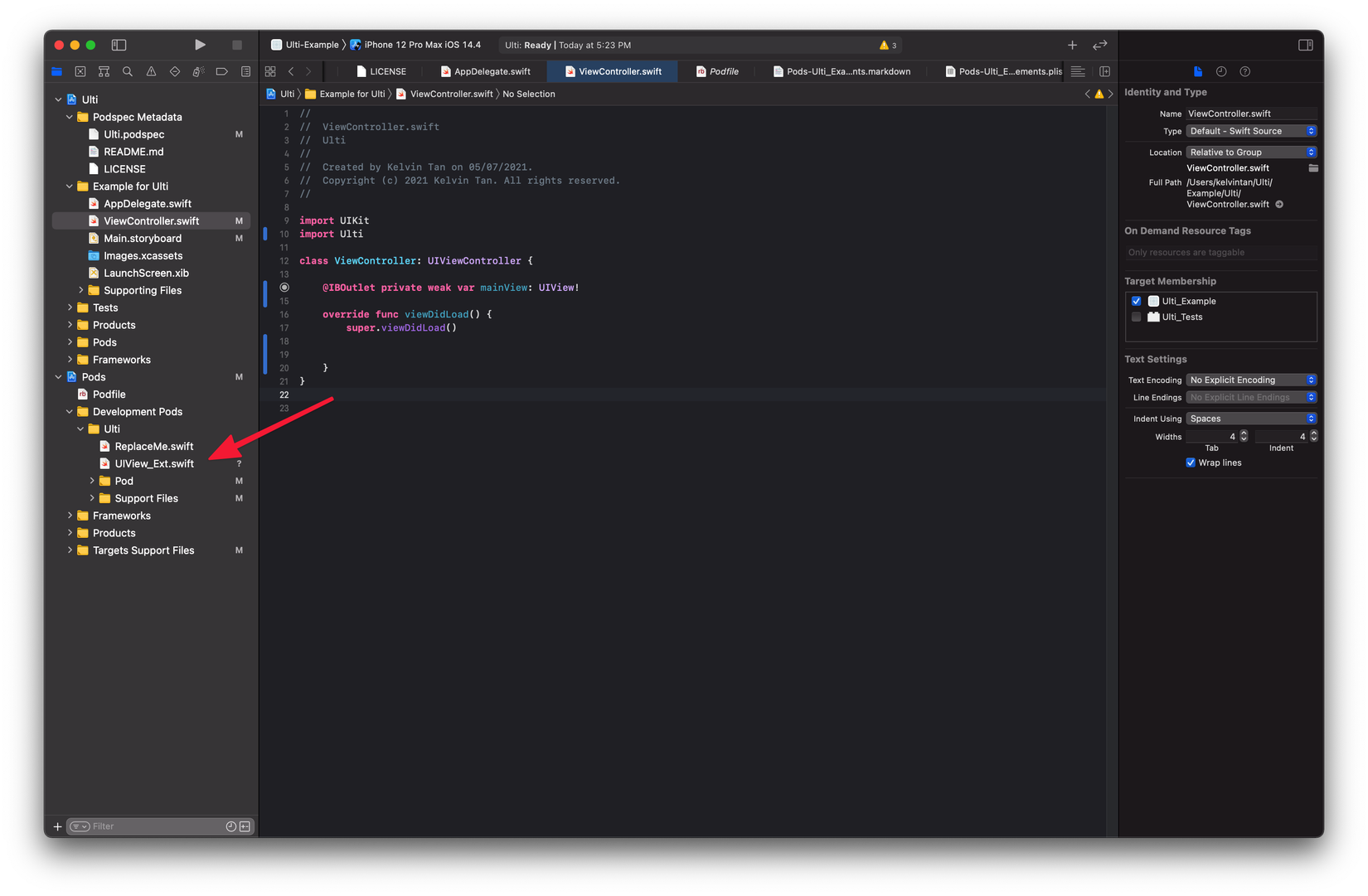 Tiếp theo, hãy chèn code vào Development Pods để bất kỳ ai quyết định sử dụng Ulti đều có thể sử dụng Code mà ta đã thêm. Bạn có thể tạo một tệp mới bên trong Development Pods > Ulti