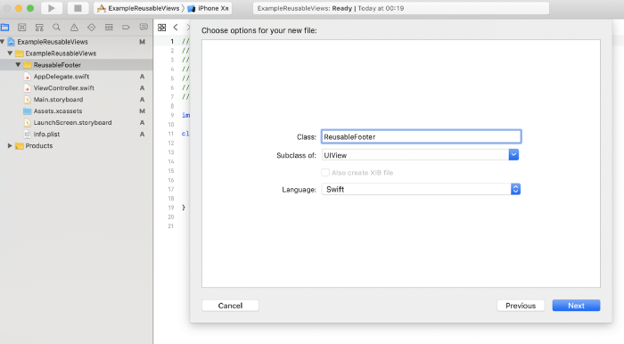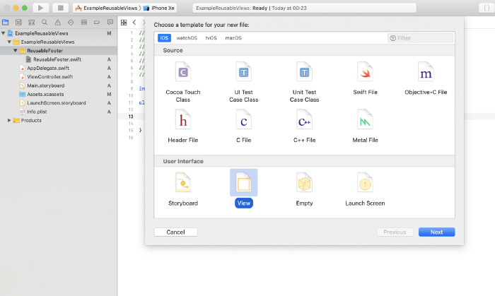 Tạo tệp mới → Cocoa Touch Class → Đặt tên bạn muốn cho chế view class của mình. Subclass UIView. Language: Swift → Next. Chọn Target