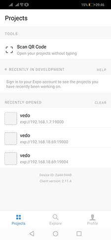 - Chúng ta sử dụng điện thoại vào phần mềm Expo mà mình đã hướng dẫn ở trên cài chọn Scan QR Code quét ảnh ở bên góc bên trái dưới chân màn hình show log như ở hình trên