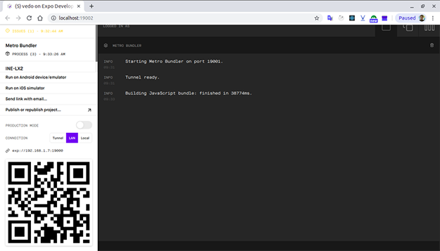 Sau khi các bạn chạy lệnh trên thì trình duyệt các bạn đang mở sẽ mở ra một tab mới hiển thị log của ứng dụng khi bạn chạy. Ở đây các bạn có thể xem các lỗi khi chúng ta code cũng như console.log() dữ liệu mà chúng ta muốn kiểm tra.