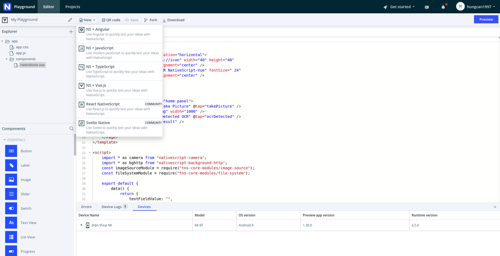Click Preview góc phải màn hình, để quét mã QR code, chúng ta phải tải app của nativeScript để có thể hiển thị Preview.