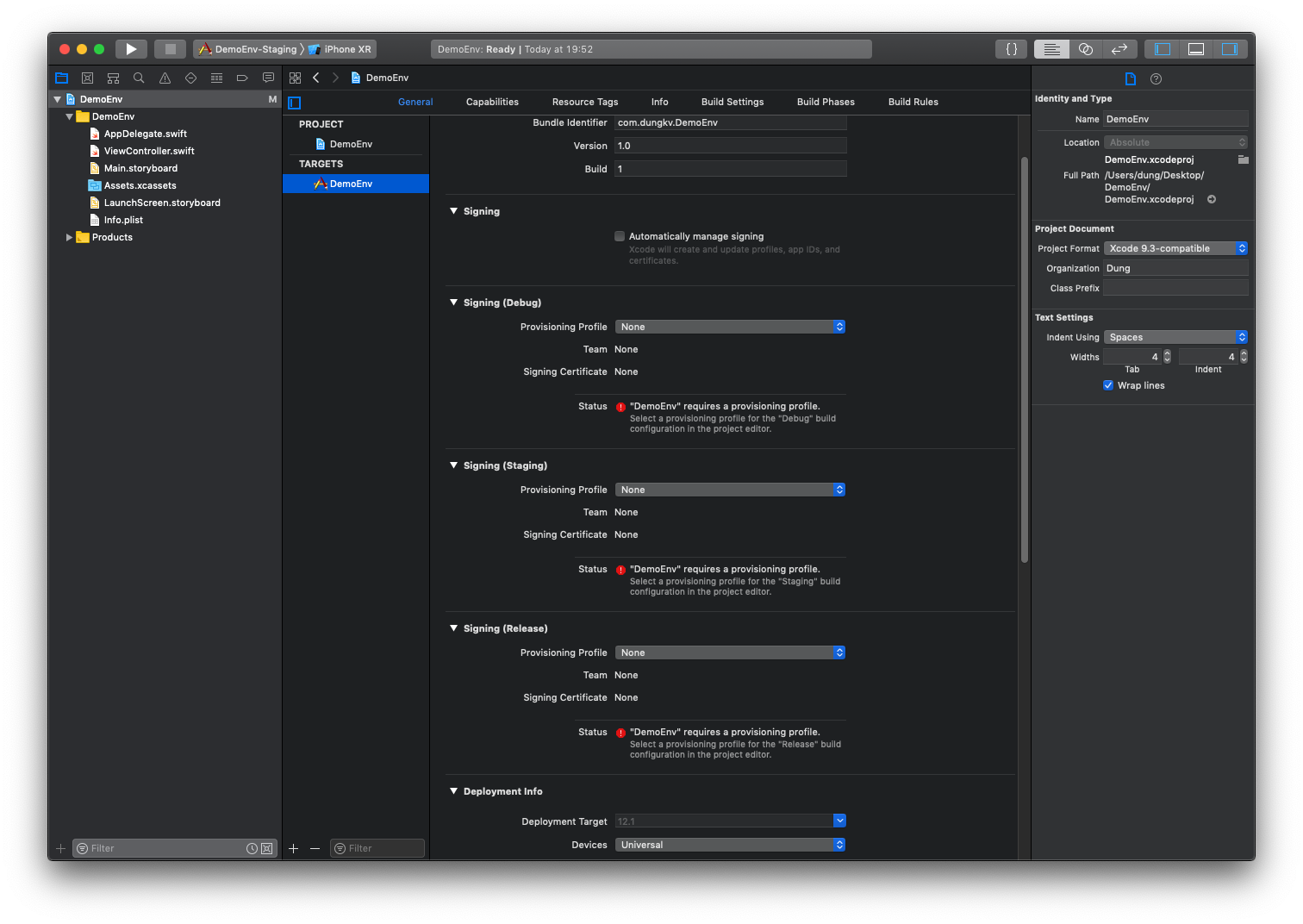 Sau khi tạo xong config, hay quay trở lại target DemoEnv, ở đây chúng ta sẽ thấy có thêm Staging. Chúng ta có thể cấu hình provisioning và certificate tương ứng cho từng config.