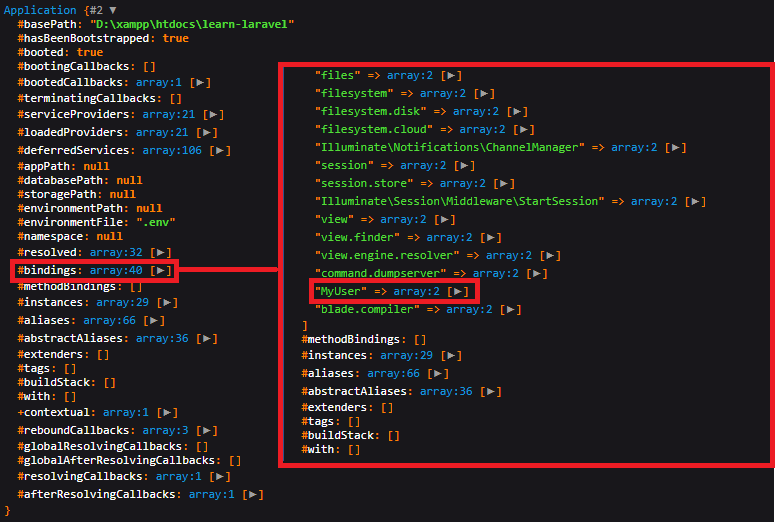 Dòng app()->make('MyUser') dùng để khởi tạo class MyUser vừa mới được bind ở phía trên theo phương thức singleton, cái này chỉ dùng để test nên bạn không cần phải hiểu bây giờ dòng này đâu nhé! Ở đây mình gọi hai lần để xem nó có trả về cùng một object hay không.