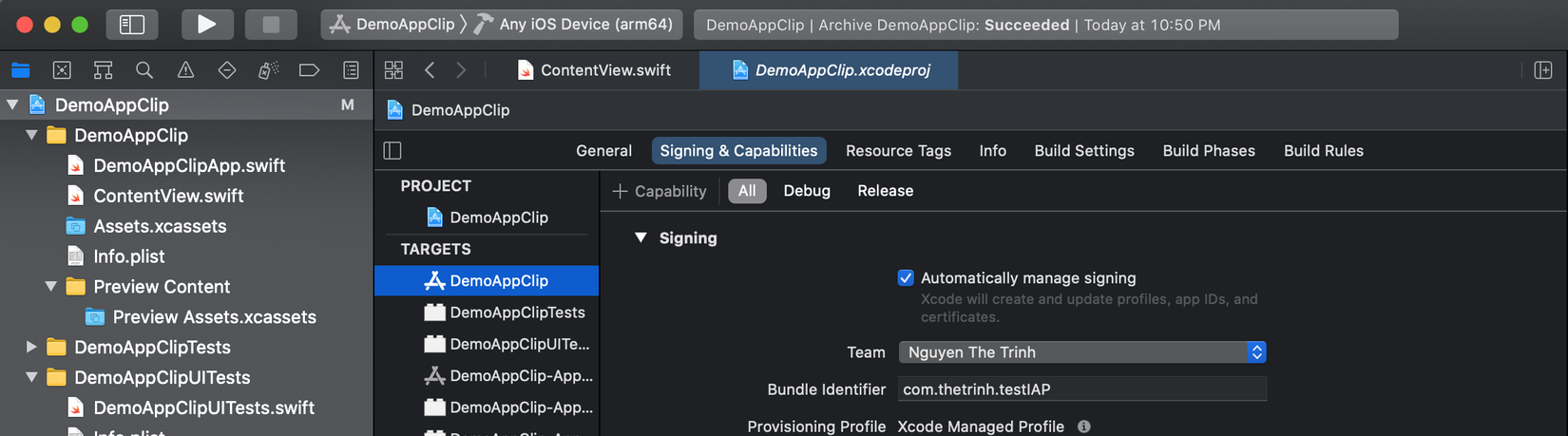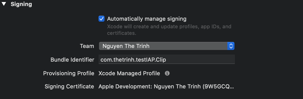 Tại target AppClip, Xcode sẽ tự động tạo 1 bundle ID cho AppClip (chọn auto), cái này sẽ match với bundle ID của App chính. Khi đẩy lên AppStoreConnect nó sẽ tự động nhận biết và đưa vào chung 1 App.