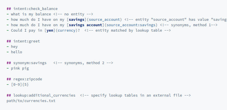 nlu.md file : Nó chứa dữ liệu đào tạo về mặt đầu vào của người dùng cùng với việc ánh xạ các intent và entity có trong mỗi câu. Nó có thêm các ví dụ khác nhau mà chúng ta cung cấp, giúp cho khả năng của bot sẽ trở nên tốt hơn. Việc bạn tạo ra nhiều dữ liệu train và đa dạng cho con bot thì độ chính xác của nó càng cao.Ví dụ: