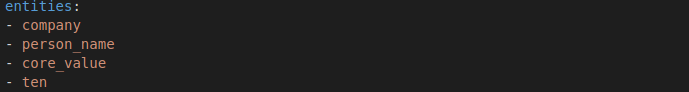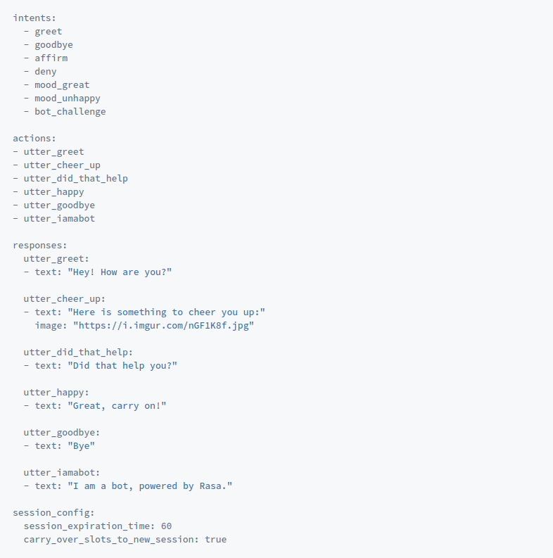 2. Một cách khác là chúng ta sẽ sài rasa core. Theo mình đánh giá thì thì nó rất tiện cho người dùng nhưng mà doc của nó thì hơi ngán. Trước tiên là file domail.yml bao gồm: intents, entities, slots và actions. responses. Bạn cần điền đầy đủ thông tin vào file nhé.