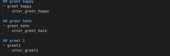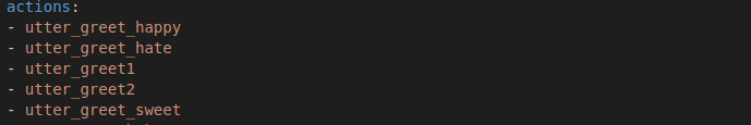 Với *greet_happy chính là intent còn utter_greet_happy là hành động mà bạn định nghĩa con bot sẽ trả lời khi nó bắt được intent đó.