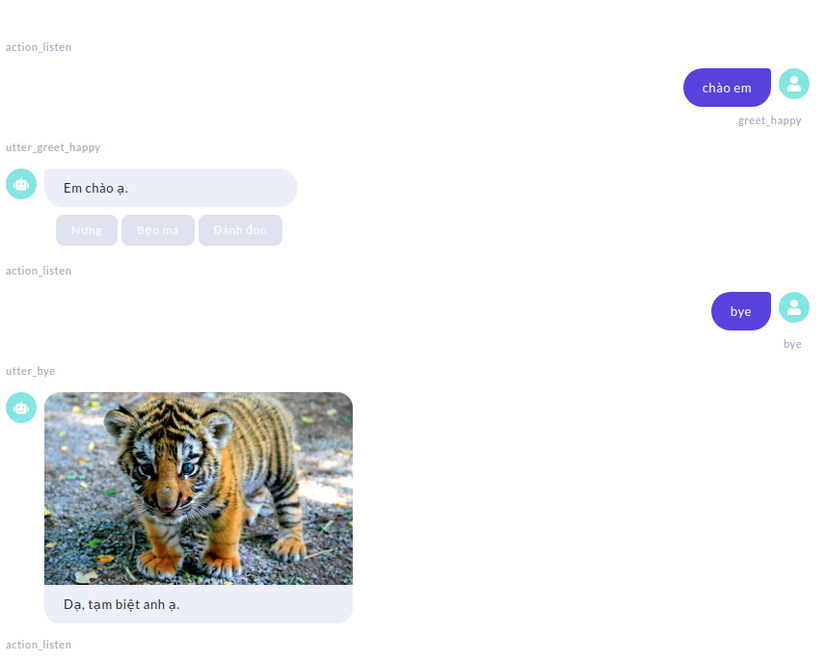 Actions trả về có thể là utter_ hoặc action_ với text là nội dung con bot sẽ trả lời bạn khi nó bắt vào intent và bạn có thể thêm button hoặc image theo responses. Bạn có thể xem ví dụ dưới đây để hiểu rõ hơn: