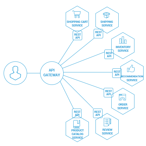 API Gateway che giấu đi thông tin kiến trúc hệ thống nội bộ và cung cấp các API tùy chỉnh cho mỗi Client. API Gateway còn có trách nhiệm xác thực, giám sát, cân bằng tải, caching, định hình yêu cầu và quản lí thông tin, xử lí phản hồi tĩnh.