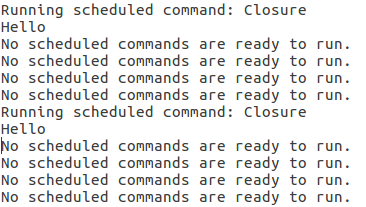 Trong 10 phút này, mỗi phút Cron sẽ thực thi schedule:run một lần. Nhưng do schedule() định nghĩa in ra "Hello" 5 phút 1 lần, nên sau 10 phút, ta chỉ in được 2 chữ "Hello".