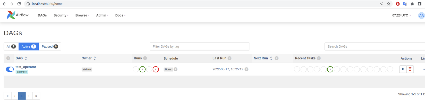 test_operatortrong trạng thái tạm dừng, chúng ta cần kích hoạt nó, sau đó trigger DAG nằm trong mục Actions ở ảnh trên. Mục Runs sẽ thống kê trạng thái của các lần chạy DAG, như ở bên trên thì tôi có 1 lần thành công và 8 lần thất bại ( do chạy thử để sửa code ). Ngoài ra bạn có thể click vào tên file DAG để xem chi tiết ( kiến trúc, ngày giờ chạy, thời gian chạy của mỗi task, ... )
