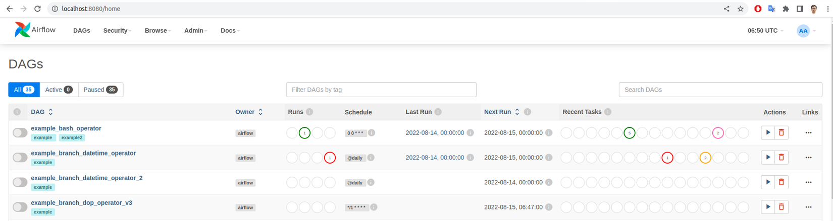 - Refresh lại WebUI để cập nhật trạng thái mới nhất. Nếu bạn kiểm tra airflow database sẽ thấy thông tin file DAG đã được lưu lại. Dùng airflow shell script để kiểm tra