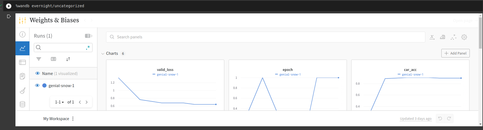 Để xem chi tiết thí nghiệm, bạn có thể ấn vào tên thí nghiệm trên hình, wandb sẽ cung cấp cho bạn thông tin về độ chính xác, hàm loss dưới dạng biểu đồ, lượng tài nguyên mà mô hình đã sử dụng ( network traffic, dung lượng ổ cứng, CPU, GPU, ... )