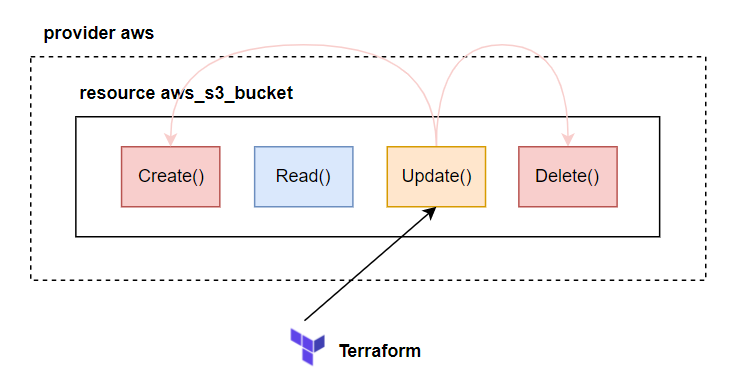 Khi ta chạy câu lệnh destroy, thì trước đó nó sẽ thực hiện plan, đọc trong state file của ta xem coi có resource đó không, nếu có thì nó sẽ thực hiện Delete() function của resource type aws_s3_bucket.