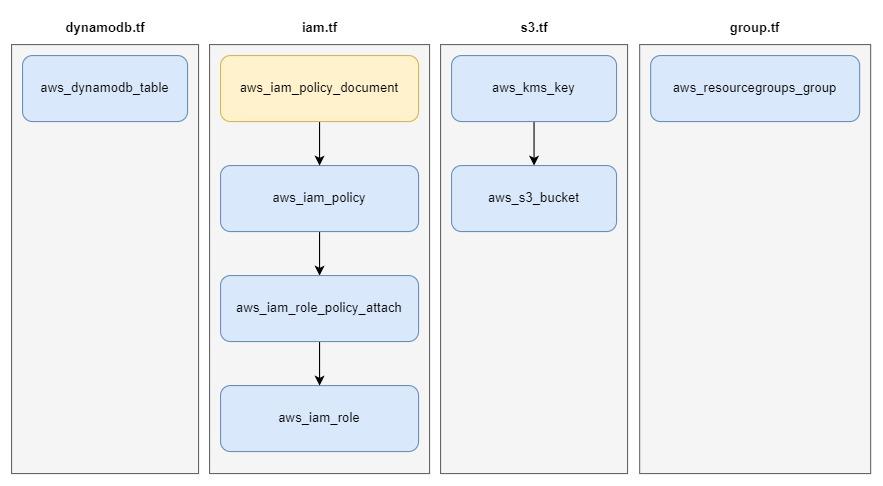 - IAM được sử dụng để terraform assume role, để terraform có quyền ghi vào dynamodb table và fetch/store state vào bên trong S3.