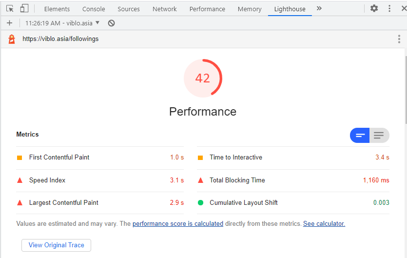 Hệ thống sẽ trả về đánh giá về hiệu năng mà hệ thống đáp ứng, ví dụ ở đây mình test cho trang https://viblo.asia/followings thì đánh giá perfomance đạt 42% ngưỡng chấp nhận được.