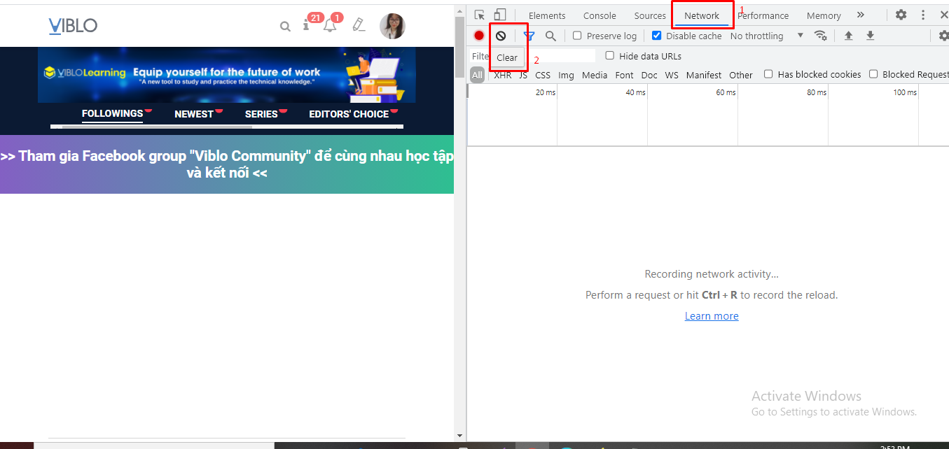 Bước 2: Nhấn Command + Option + I (Mac) hoặc Control + Shift + I (Windows, Linux) để mở DevTools. Chọn Network -> Clear