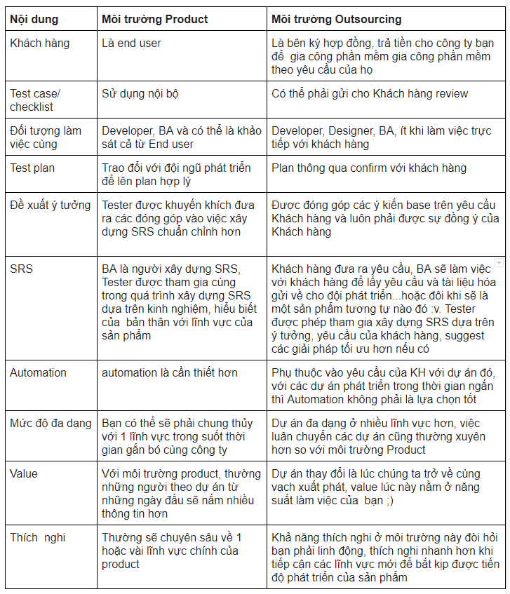 2 - Sự khác nhau giữa vai trò Tester trong môi trường Product và Outsourcing