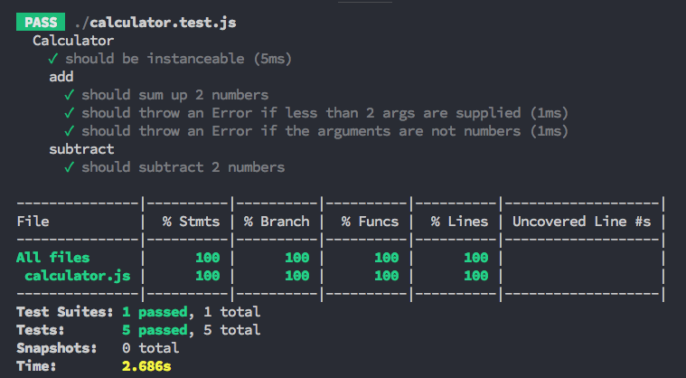 Jest tự động phát hiện các tệp kiểm tra có .test hoặc .spec hậu tố, cũng như các tệp .js trong một thư mục __tests__. Đó là lý do tại sao tôi đặt tên cho Unit Test calculator.test.js