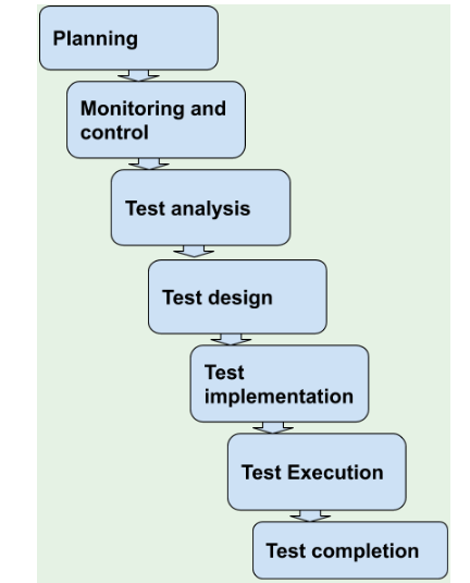| Test planning | - Định nghĩa chiến lược và hướng tiếp cận test - Xác định phạm vi kiểm thử - Nêu tất cả các giả định và điều kiện - Xác định nhiệm vụ và công cụ test - Xác định mục tiêu và rủi ro liên quan với quá trình test - Lập kế hoạch về tài nguyên, môi trường test |