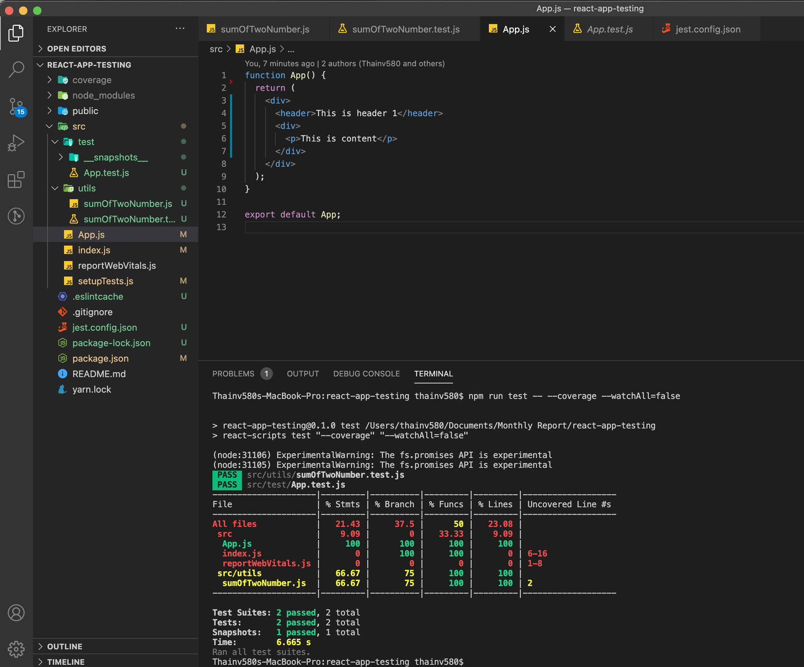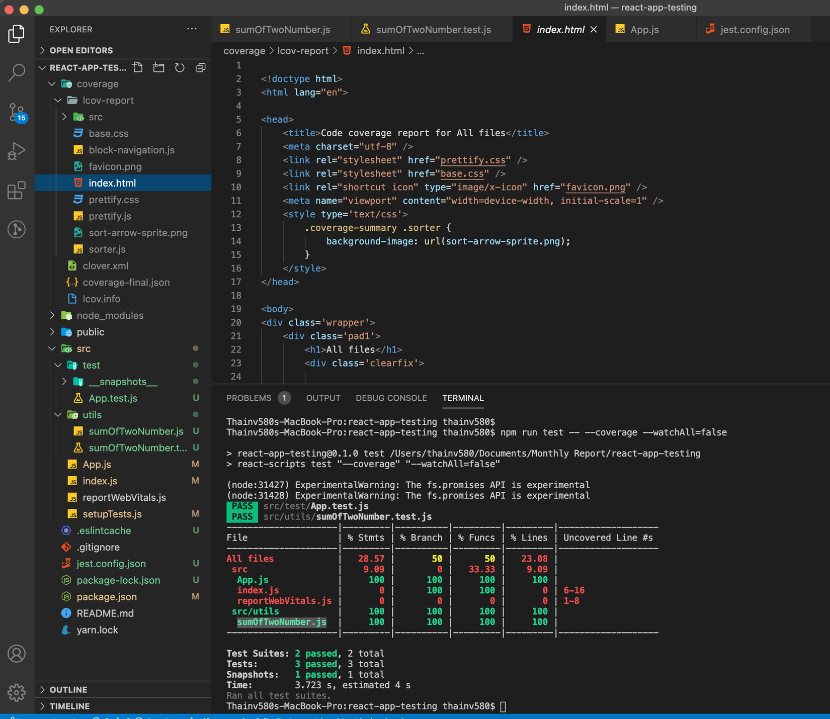 Và run nào: `npm run test -- --coverage --watchAll=false`