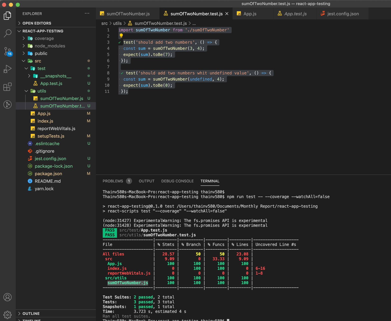 - VD: Bạn để ý ở bảng report thì function sumOfTwoNumber của mình đang có %Branch là 75 và có line 2 chưa cover, vậy để cover cho line 2 này thì mình sẽ viết thêm test case cho nó ở file sumOfTwoNumber.test.js như sau: