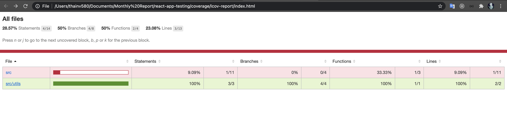 Và khi bạn click vào src hoặc src/utils thì sẽ hiển thị chi tiết hơn những file còn thiếu, line nào chưa coverage ...