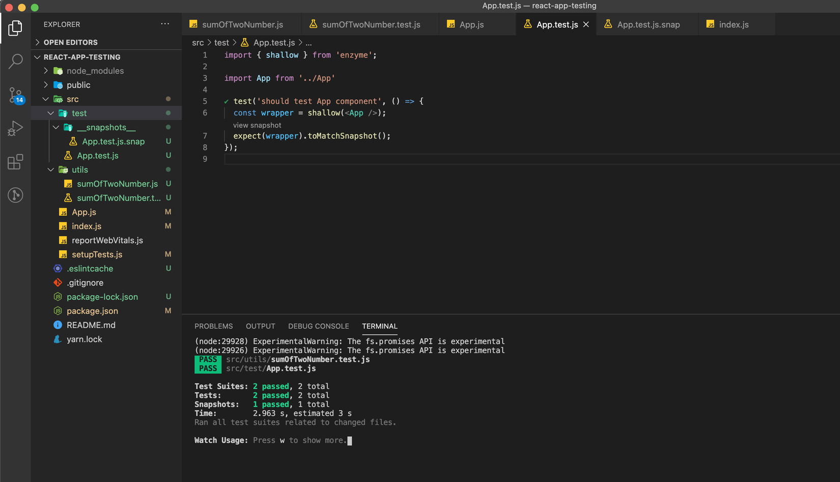 Bạn có để ý, trong thư mục test có folder snapshots được sinh ra và bên strong nó là file snapshots App.test.js.snap, nếu tò mò thì bạn có thể mở nó lên xem thử. (nhớ kiểm tra lại nó khi thay đổi ở file App.js - như thêm className, và update lại snapshot như bên dưới)