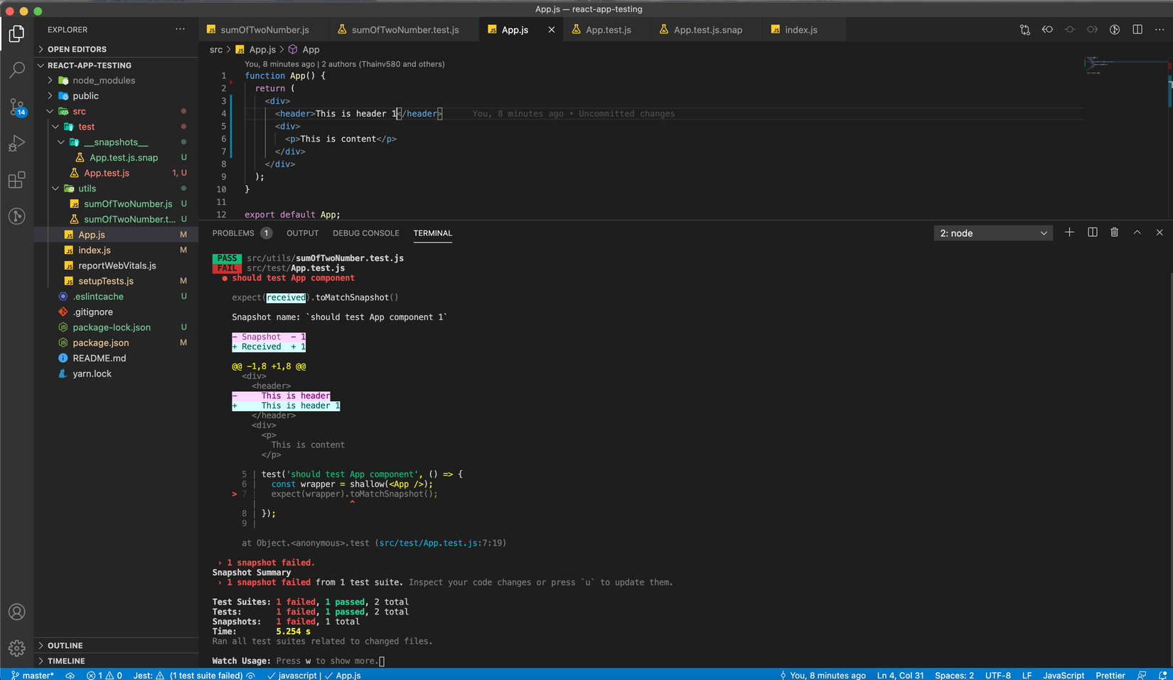 Quan sát kết quả ở dưới thì có thể thấy terminal báo lỗi test case should test App component và nguyên nhân là do snapshot khác nhau do chưa được update. Để khắc phục điều này thì bạn nhấn phím u ở terminal sau đó enter và jest sẽ chạy lại để update snapshot cho bạn.
