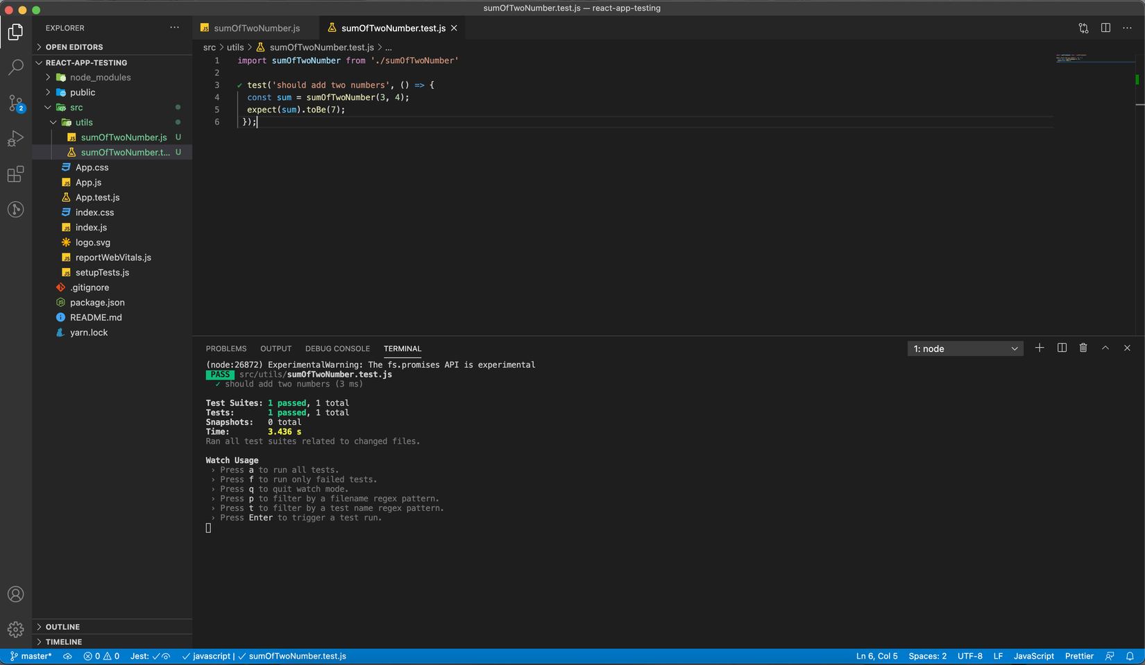 Ngoài ra mình còn tạo file sumOfTwoNumber.test.js và import file sumOfTwoNumber.js vào để test với nội dung bên như sau (Lưu ý là file test phải có đuôi .test.js để jest biết đây là file test và nó tự tìm kiếm để chạy)