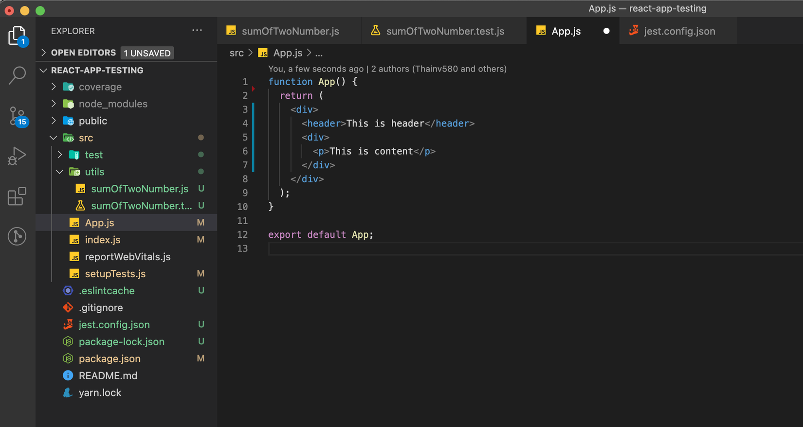 Giờ thử thay đổi file App.js 1 chút nhé, change title theo ý của bạn và save, của mình thì change từ This is header sang This is header 1.